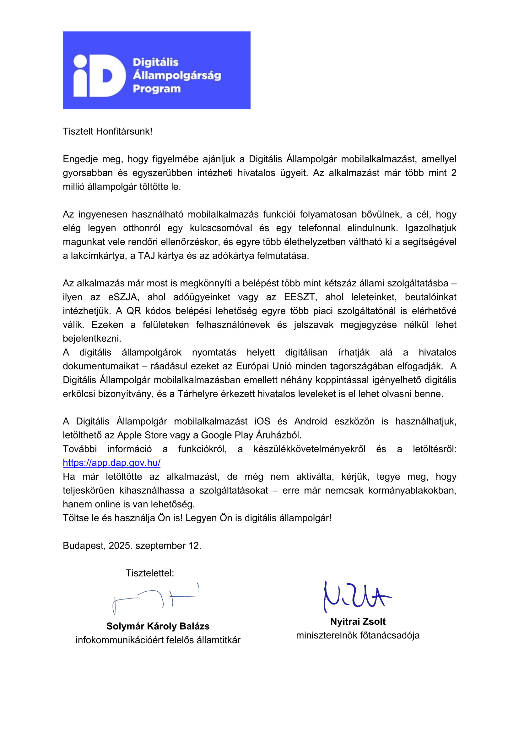 Bővülnek a Digitális Állampolgárság "iD" mobil alkalmazás szolgáltatásai 2025. szeptember 18.. Bővülnek a Digitális Állampolgárság "iD" mobil alkalmazás szolgáltatásai Olvassa el a tájékoztatót. Nyomtatás