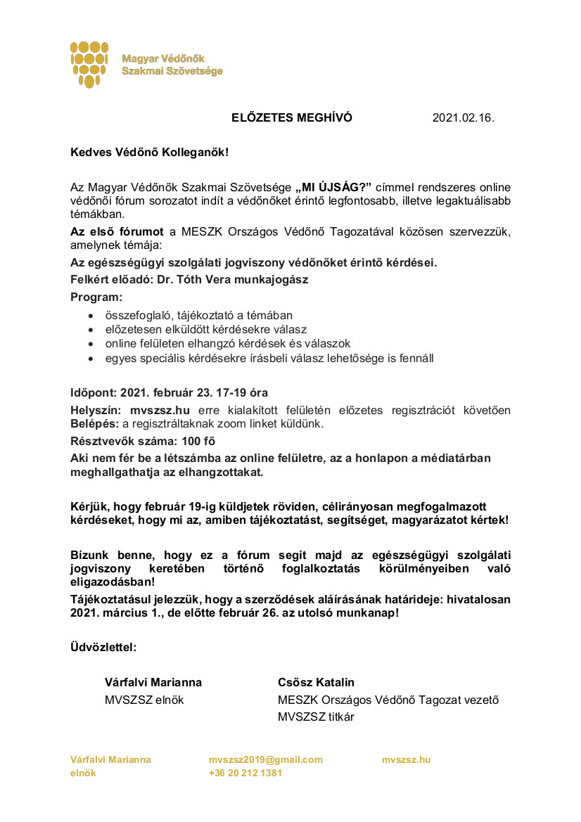 Előzetes meghívó: a "MI ÚJSÁG?" online védőnői fórumra ami az egészségügyi szolgálati jogviszonnyal fog foglalkozni munkajogász előadó meghívásával 2021. február 23-án 17-19 óráig. A részvétel az mvszsz.hu honlapon regisztrációhoz kötött.